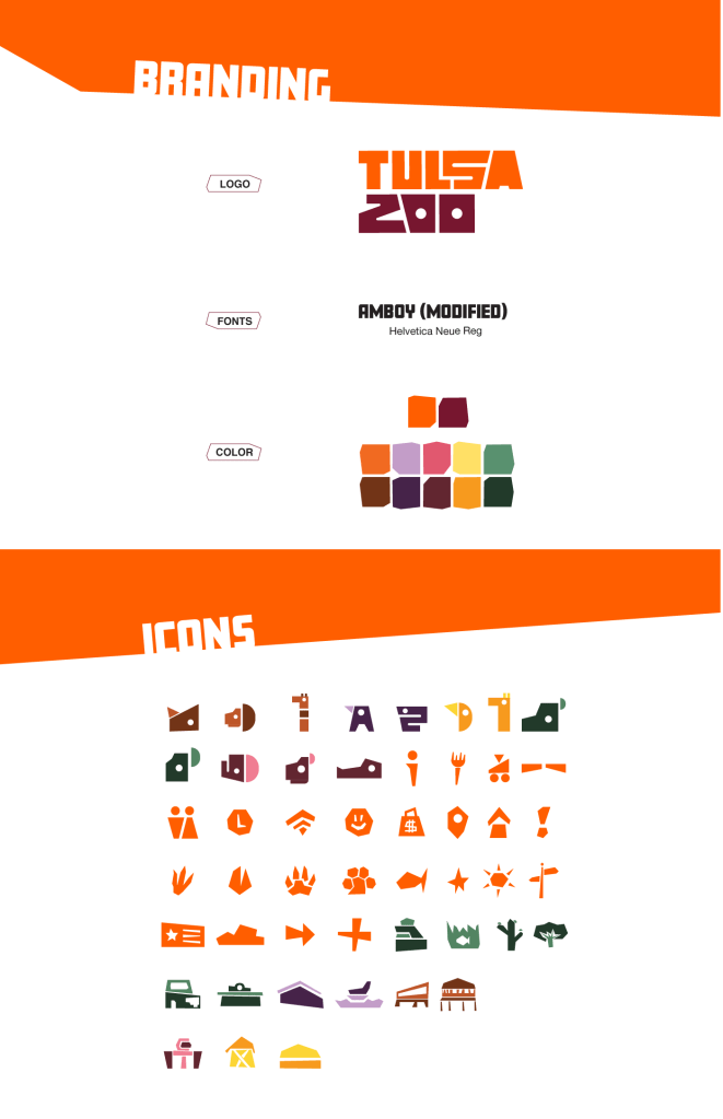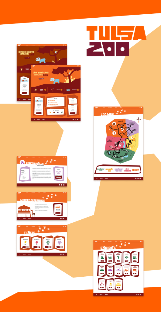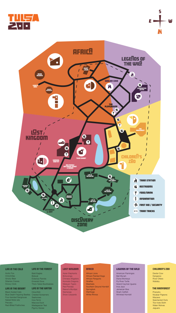 Tulsa Zoo is a zoo focused on recreation, education, and conservation. It is about cultivating an environment for all to enjoy and explore. The design is for people wanting to learn, no matter their age. It is playful while still remaining structured. The website will be used prior to arrival to ease the experience once they arrive. From finding their favorite animal to locating the First Aid desk, the map will be used as an aid throughout the park.